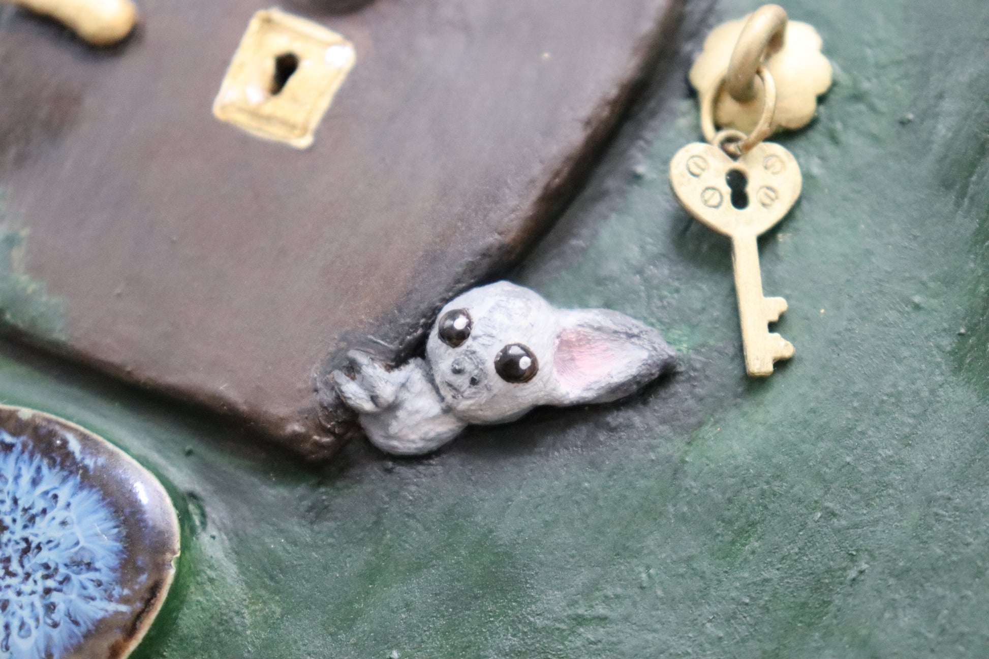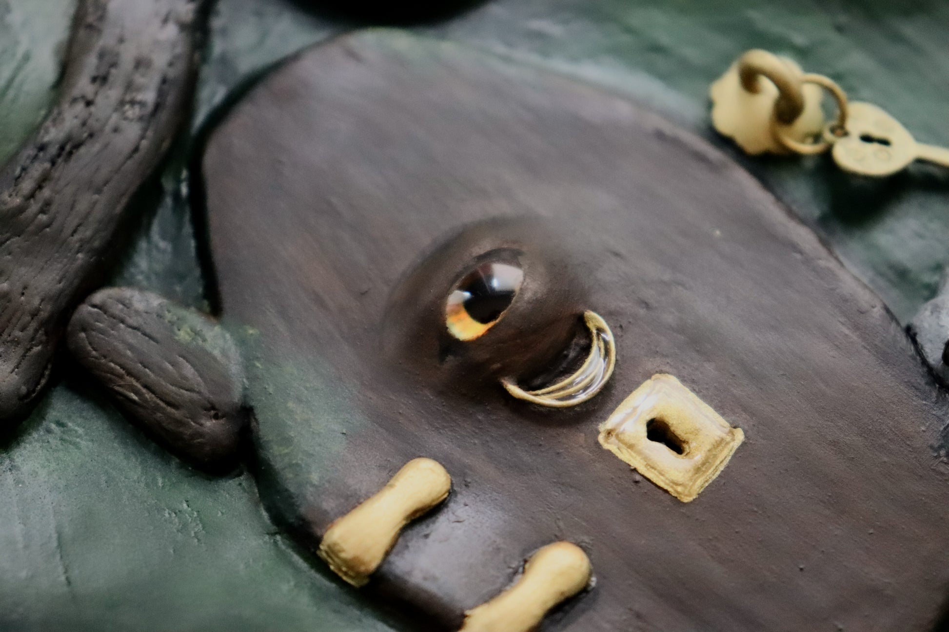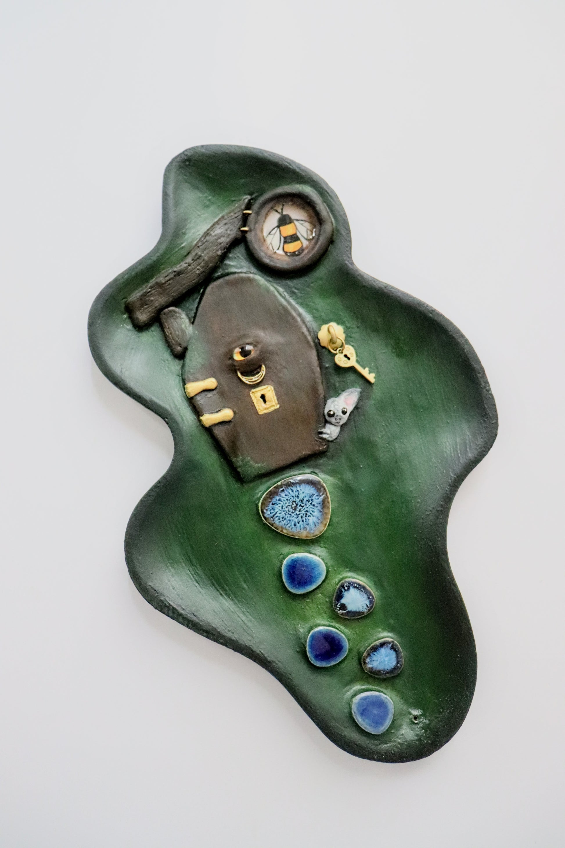 Er sieht aus wie eine winzige Mooslandschaft mit Tür und einem Schlüssel, Gehsteinen und einem Fenster mit einer leuchtenden Biene, dessen Flügel im Dunkeln glimmt und einem kleinen mystischen Wesen.
