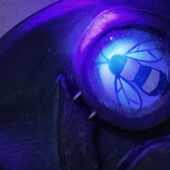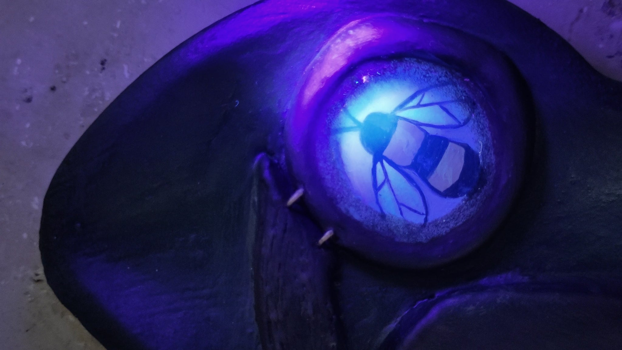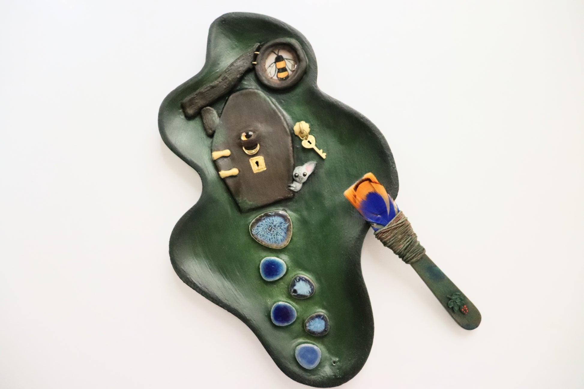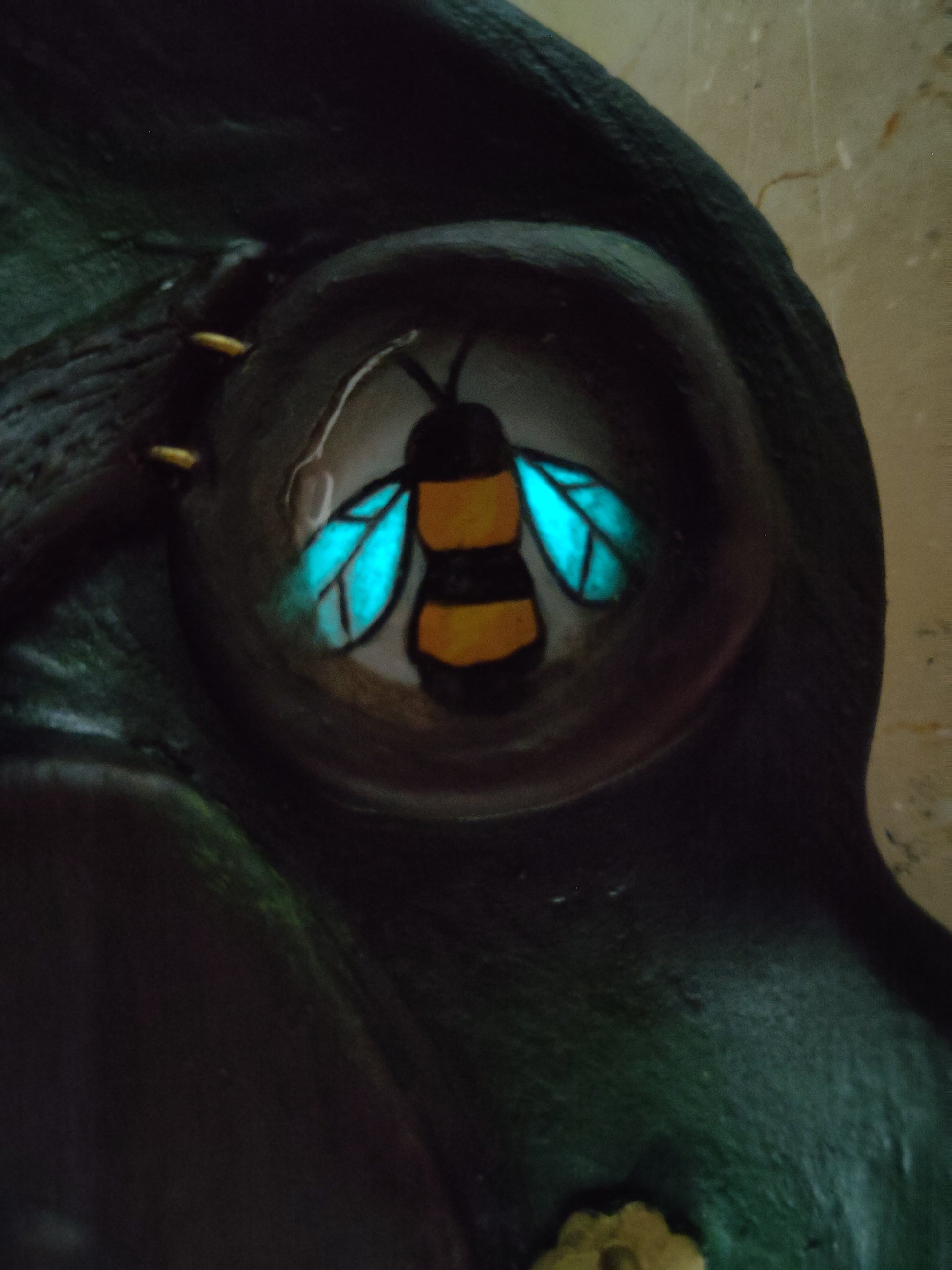 Er sieht aus wie eine winzige Mooslandschaft mit Tür und einem Schlüssel, Gehsteinen und einem Fenster mit einer leuchtenden Biene, dessen Flügel im Dunkeln glimmt und einem kleinen mystischen Wesen.