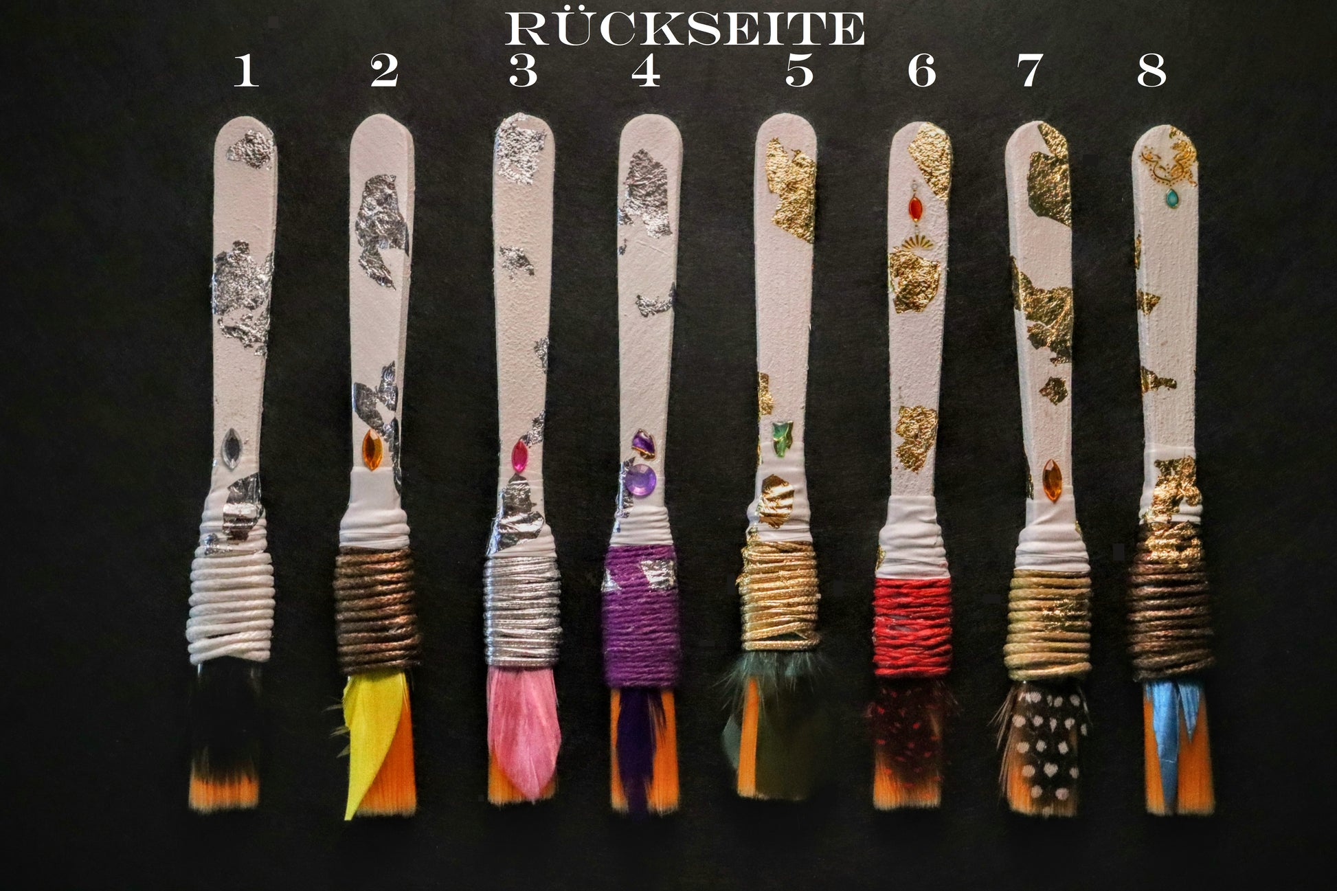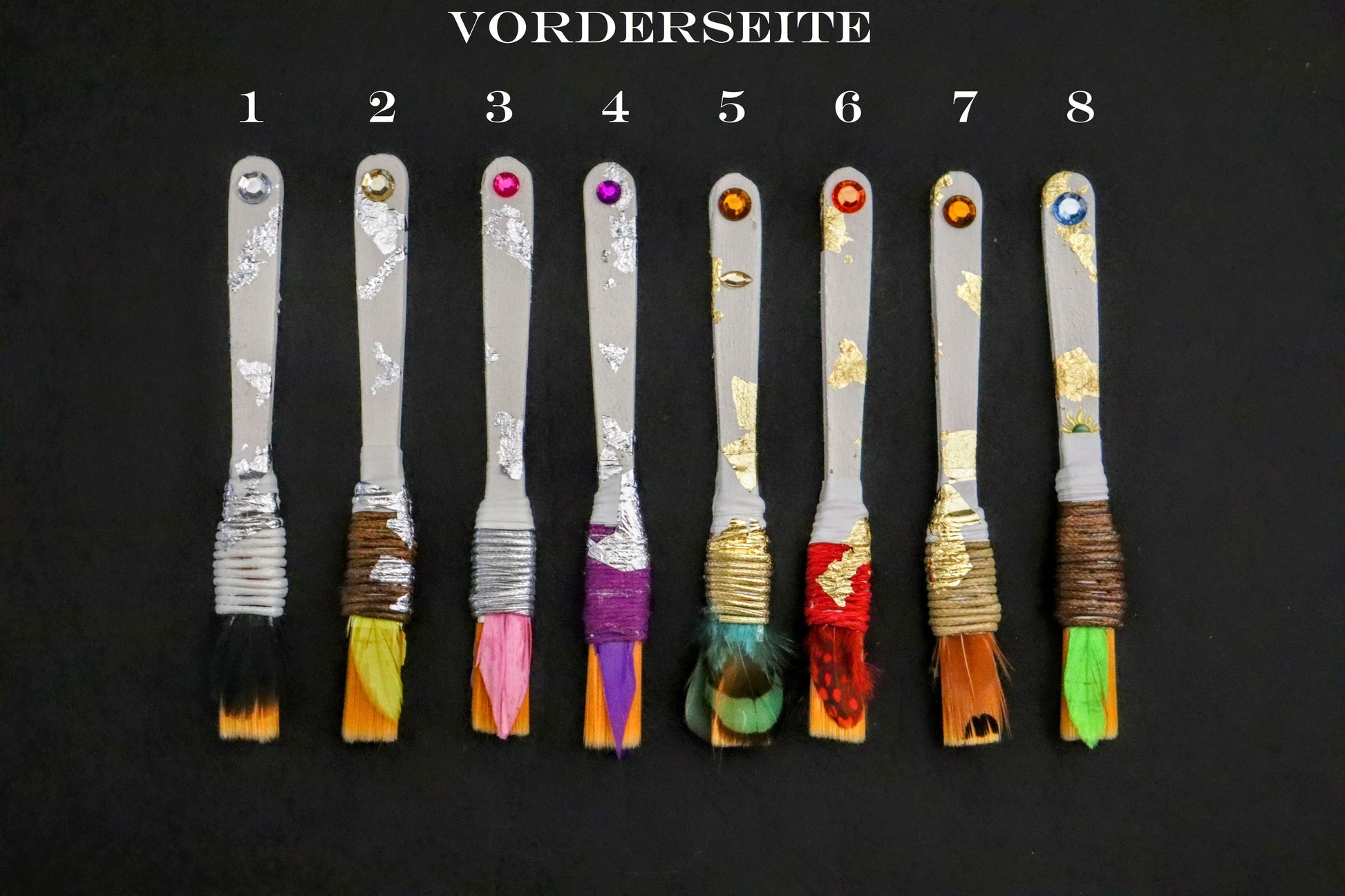 Jeder Pinsel ist einzigartig verziert und in verschiedenen Farbvarianten erhältlich. Bitte gib bei deiner Bestellung einfach die Nummer deines Wunschpinsels an (siehe Foto).